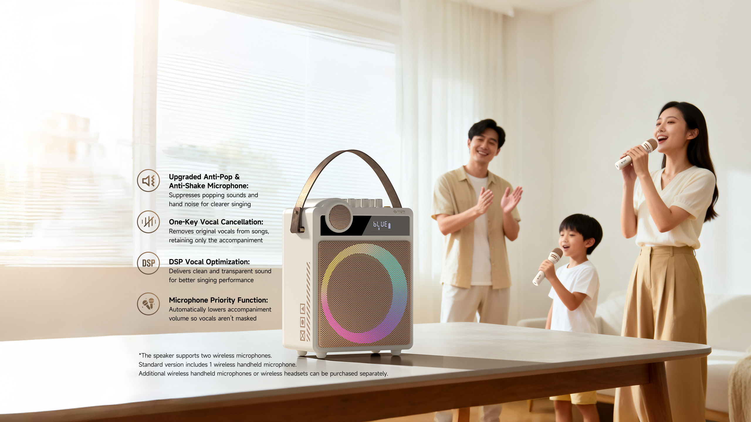 duets. Equipped with upgraded anti-pop and anti-shake microphones, it